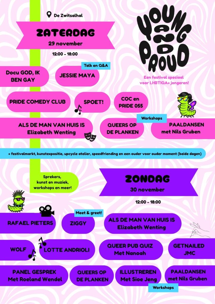 Het is bijna zover! Op zaterdag 29 en zondag 30 november verandert de Zwitsalhal in Apeldoorn in het decor van het Young and Proud Festival: hét festival voor LHBTIQA+ jongeren uit Apeldoorn en omgeving.